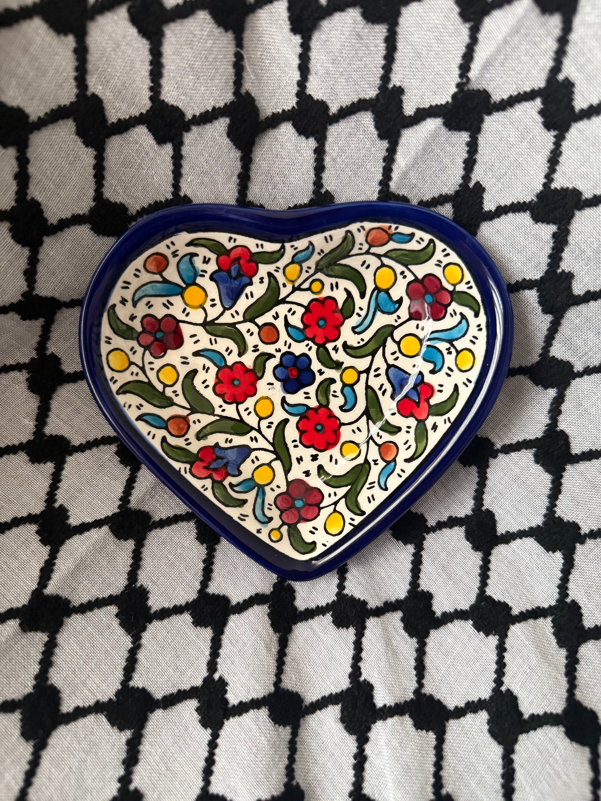 Featuring the heart shaped design this piece blends cultural symbolism with genuine Palestinian craftsmanship.