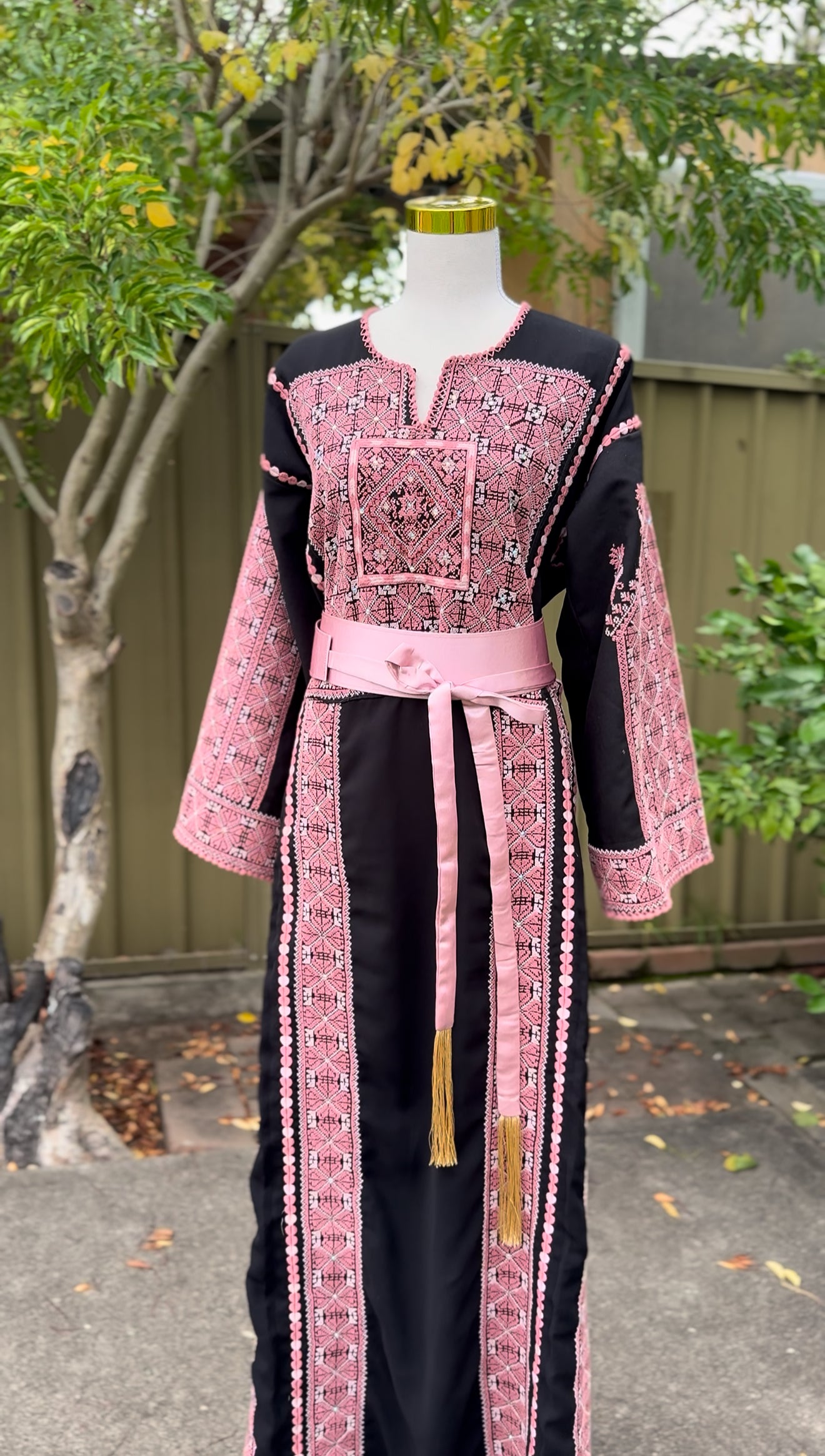 Pink and Black Hand Beaded and Hand Embroidered Thobe handmade in Palestine.