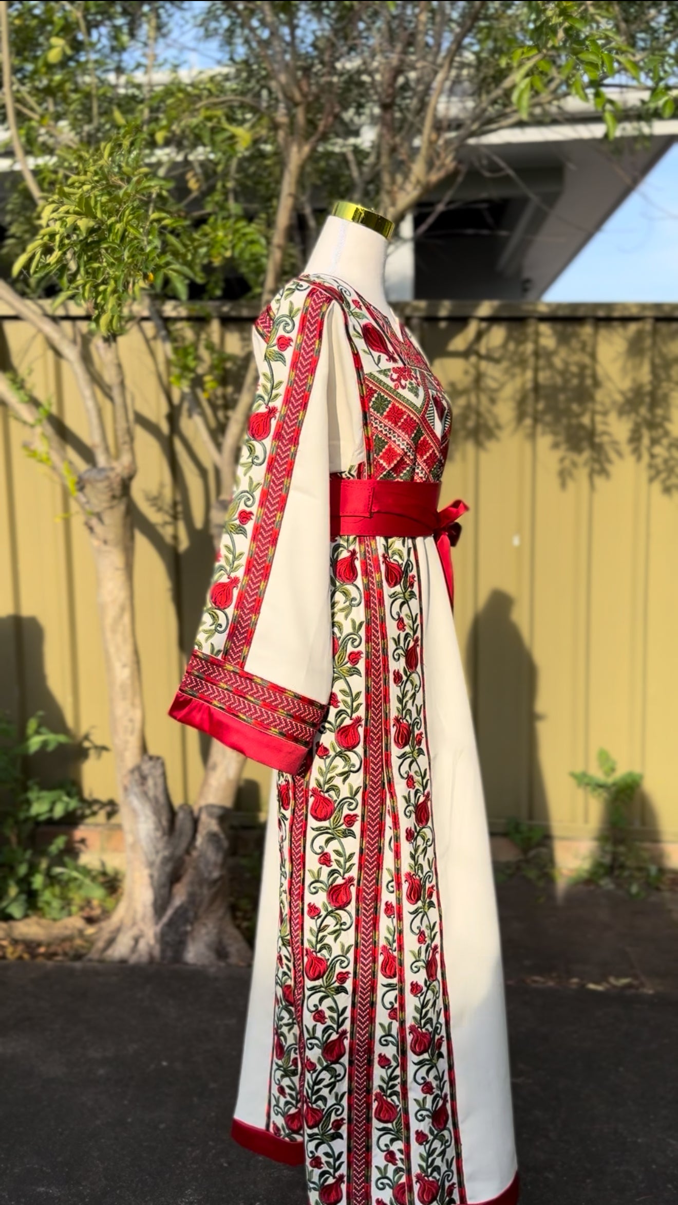 In Palestine, the Pomegranate (or Romman in Arabic) is more than a fruit. It’s a symbol of fertility, richness, abundance, prosperity and the richness of the land and heritage. It is deeply integrated into the Palestinian identity appearing in folk, traditional cuisines like rummaniyeh and molasses, as well as handcrafted embroidery.