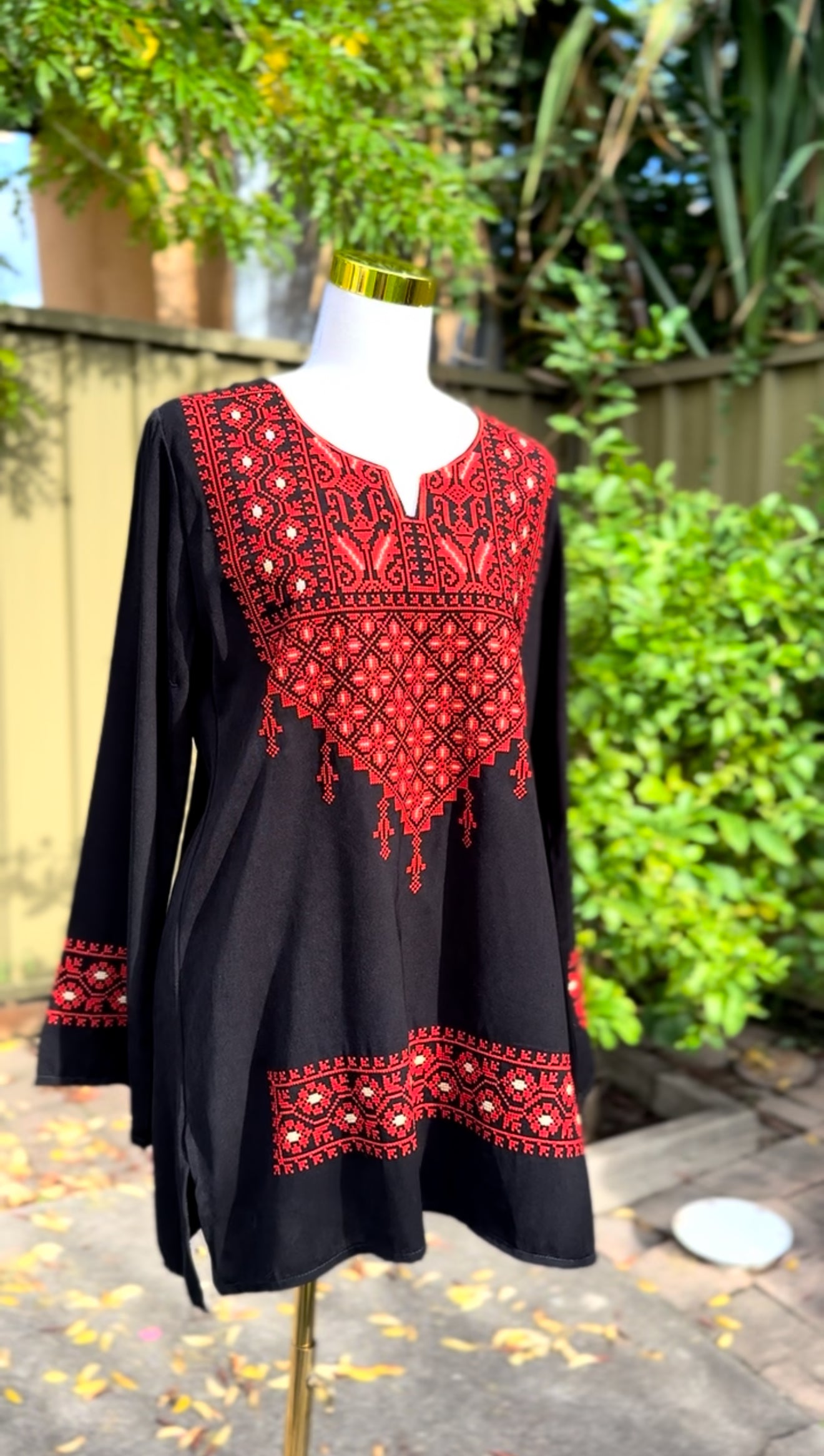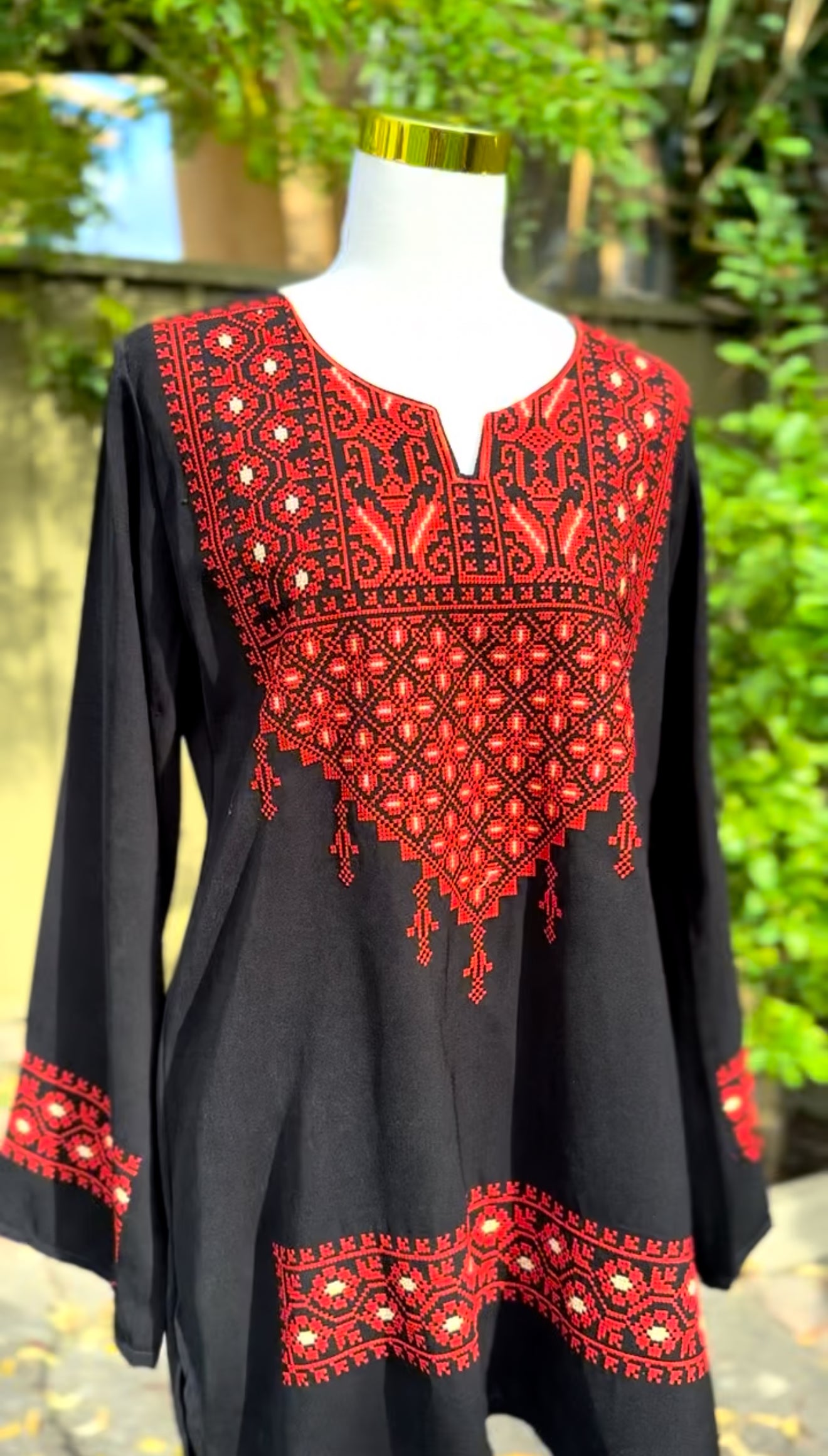 Beautiful Red and Black Embroidered Shirt showcasing the beauty of the Palestinian Culture and Heritage. Perfect for formal occasions or casual wear.